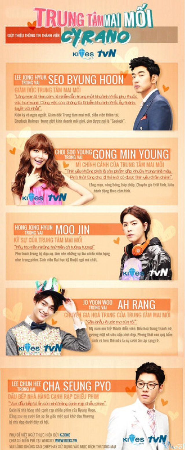 Dating Agency: Cyrano : Dating Agency: Cyrano là bộ phim truyền hình dựa theo phim điện ảnh cùng tên, kể về một đội ngũ được thuê để giúp những người đang gặp khó khăn trong cuộc sống tình cảm. Họ lập nên những kế hoạch tỉ mỉ, giúp khách hàng có được người yêu. NHÂN VẬT